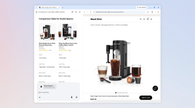 Por exemplo, se quiser comprar uma cafeteira nova, você pode descrever o que procura no Modo AI e obter uma variedade de opções. Depois de clicar em um, você pode abrir o website do varejista junto com o Modo AI e fazer perguntas específicas, como “quão fácil é limpar isso?” O Modo AI usará o contexto da página e de toda an internet para responder às suas perguntas.