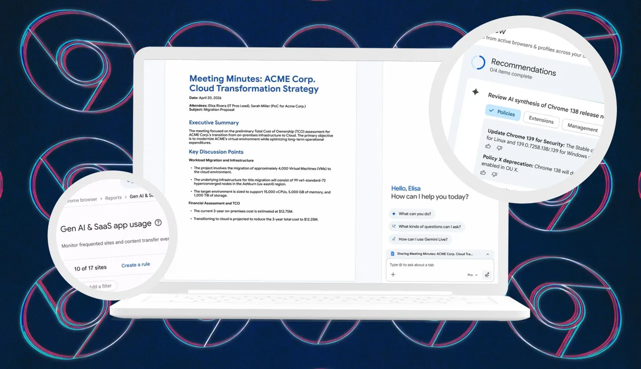 O Google anunciou novos recursos do Chrome especificamente para empresas. A atualização traz recursos de IA aos trabalhadores, ao mesmo tempo que dá às equipes de TI maior controle sobre quais ferramentas de IA são usadas no native de trabalho. O Chrome Enterprise agora é um lugar onde o trabalho é realizado, a IA opera inline e os administradores podem reforçar a segurança, tudo dentro do navegador.