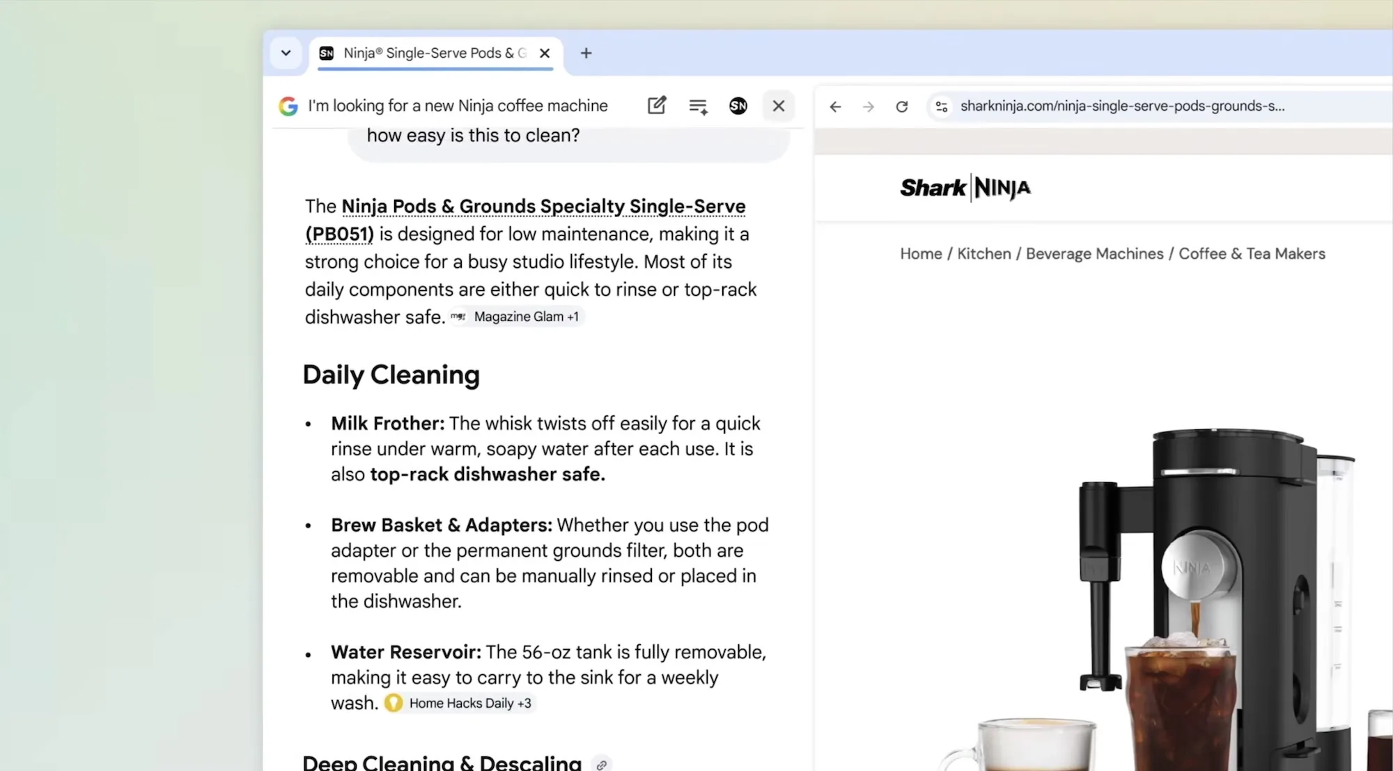 O Google deu um exemplo de compras para ilustrar esse recurso. Digamos que você esteja comprando uma cafeteira compacta que possa preparar um café com leite decente. Você descreve o que deseja no Modo AI e procura. Você encontra um modelo que gosta e clica no hyperlink dele. Em vez de abrir em uma nova aba, ele abrirá ali mesmo, no lado direito.