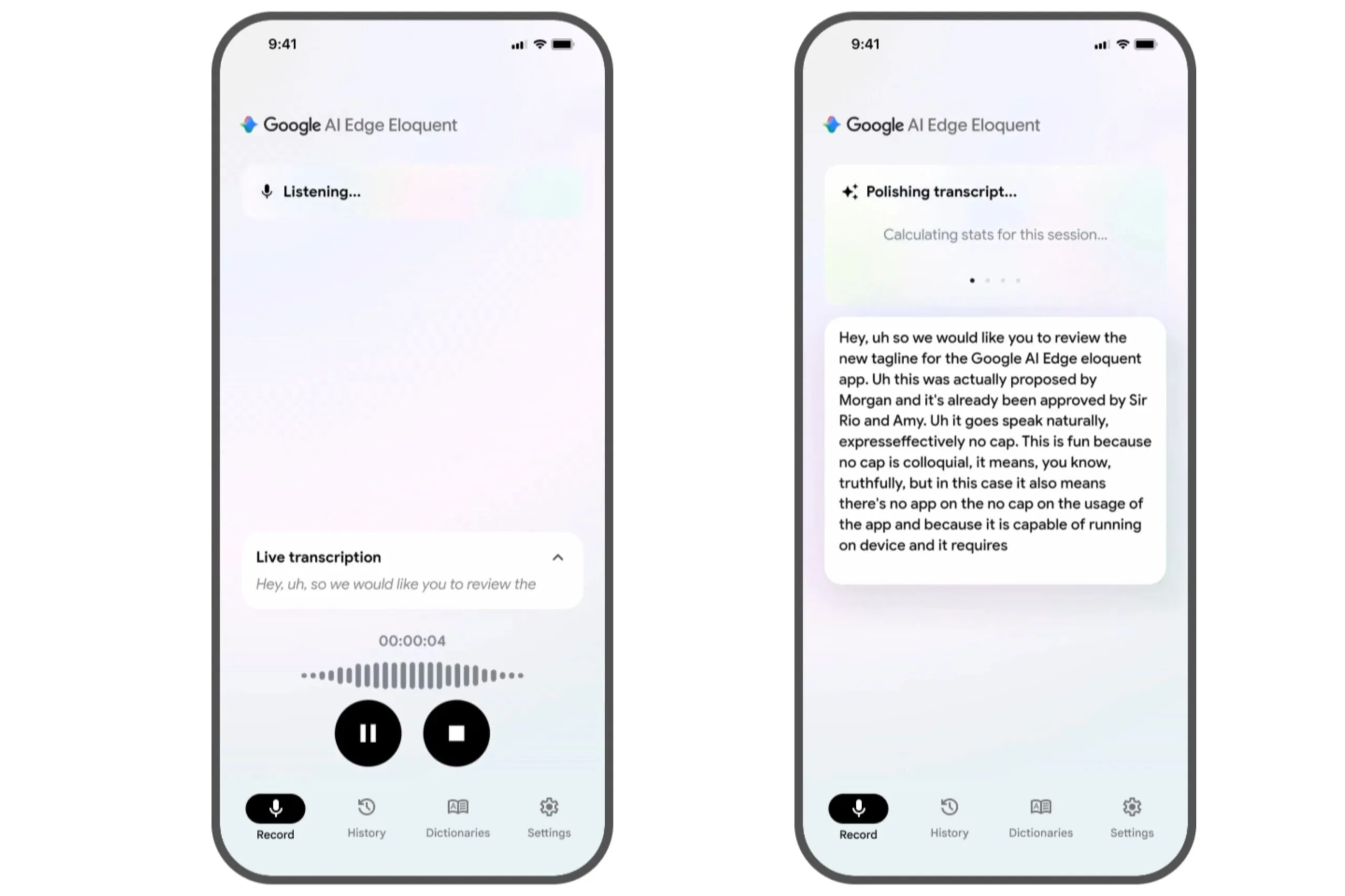 O Google lançou hoje um novo aplicativo iOS sem nenhum anúncio oficial. O aplicativo, descoberto pela primeira vez por 9to5Googleé chamado Google AI Edge Eloquente. É uma ferramenta de ditado de voz off-line que transcreve sua fala em tempo actual, elimina automaticamente palavras de preenchimento e fornece texto limpo e sofisticado. O Google Eloquent é totalmente gratuito, sem qualquer assinatura ou limite de uso.