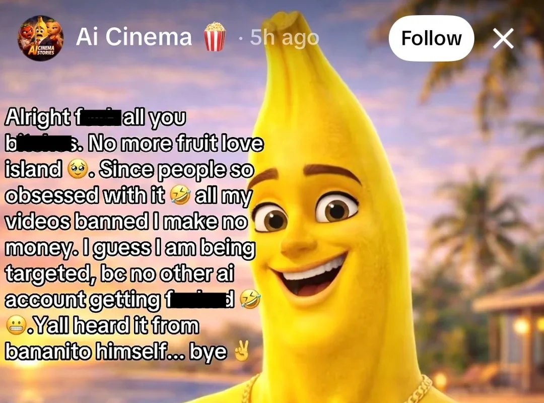 “Certo, todos vocês, idiotas. Chega de ilha do amor de frutas 🥺. Já que as pessoas estão tão obcecadas com isso 🤣 todos os meus vídeos foram banidos eu não ganho dinheiro. Acho que estou sendo um alvo, porque nenhuma outra conta de IA está sendo fodida 🤣 😬. Vocês ouviram isso do próprio bananito.. tchau✌️”