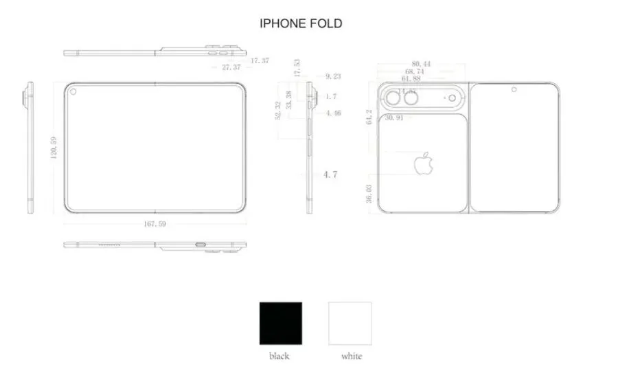 As renderizações também apontam para uma espessura máxima de cerca de 13mm quando a área da câmera é incluída. Isso tornaria o módulo da câmera uma parte importante do perfil do telefone, mesmo que o corpo dobrado permanecesse surpreendentemente fino para um dobrável estilo livro. O mesmo vazamento também repete afirmações anteriores de que a Apple está preparando duas opções de cores, prata e preto.