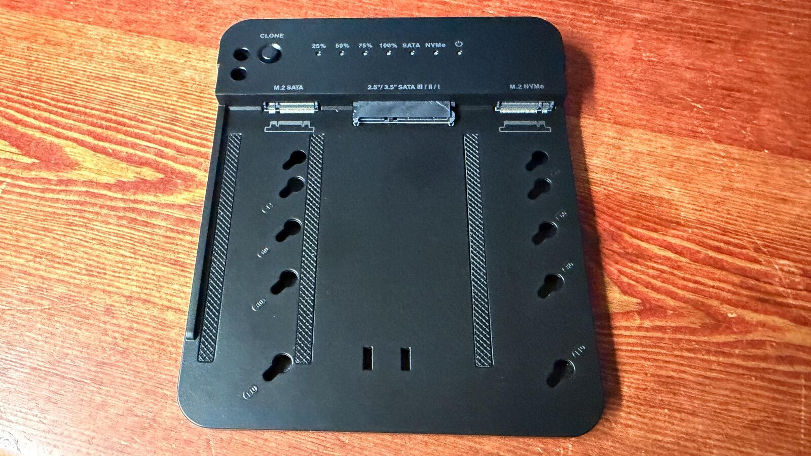 Como o nome sugere, este dispositivo funciona tanto como dock quanto como estação clone. Para usá-lo como dock, você conecta uma unidade – o dispositivo suporta unidades SATA e NVMe M.2 de 22/42/60/80 mm, bem como unidades SATA I/II/III de 2,5 e 3,5 polegadas – e conecta a unidade a um computador e, assim, você tem acesso à unidade.