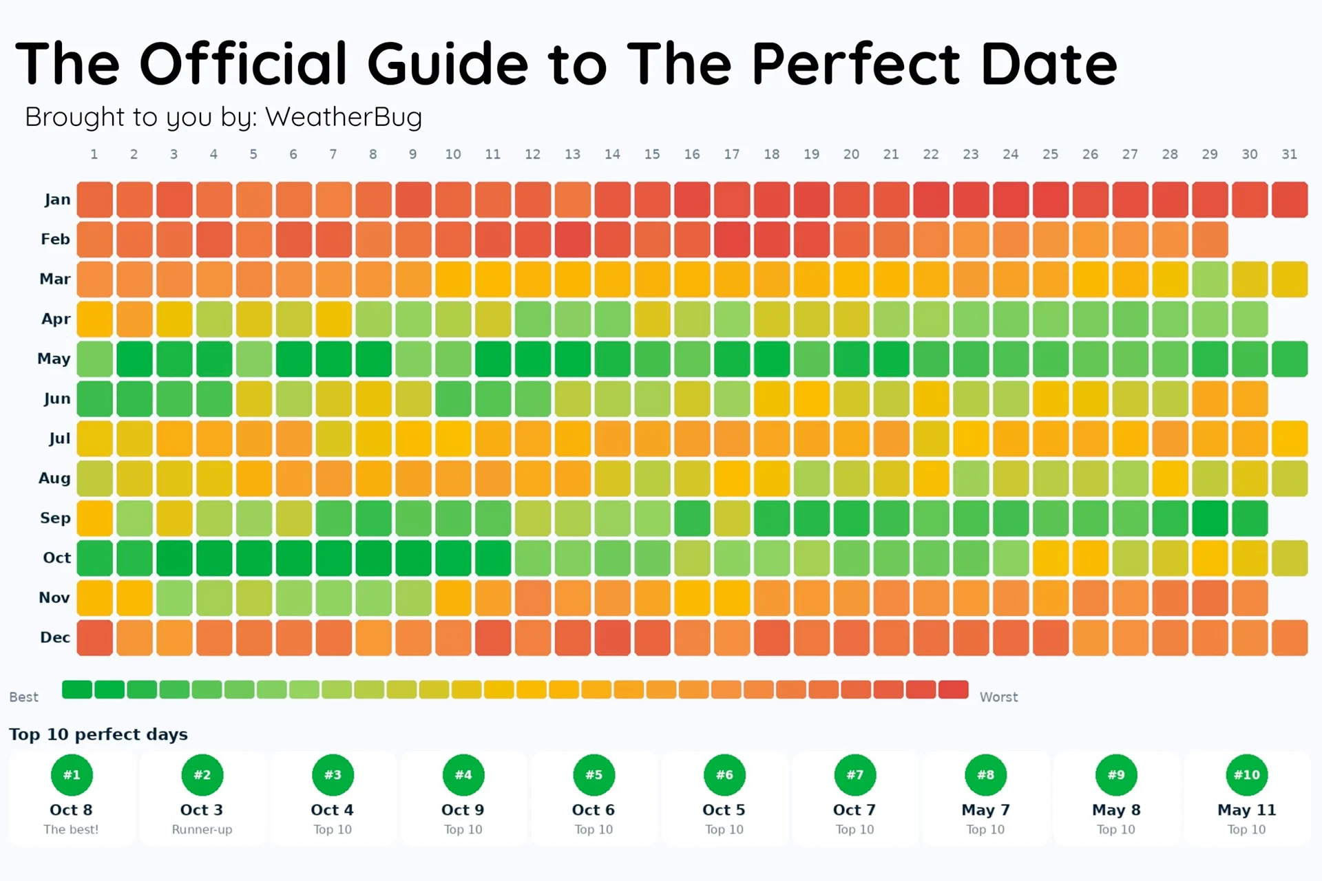 Essa diversidade climática torna um pouco difícil identificar um único dia perfeito – o dia mais agradável no clima do tipo Cwb (inverno temperado e seco, verão quente) da Península Olímpica do estado de Washington provavelmente ocorrerá em um horário muito diferente do que, digamos, no clima do tipo BWh do Arizona (deserto seco, quente e árido). Mas! Em média! O melhor dia do ano é 8 de outubro. Na verdade, outubro dominou absolutamente as paradas, conquistando todos os 5 primeiros lugares da parada.