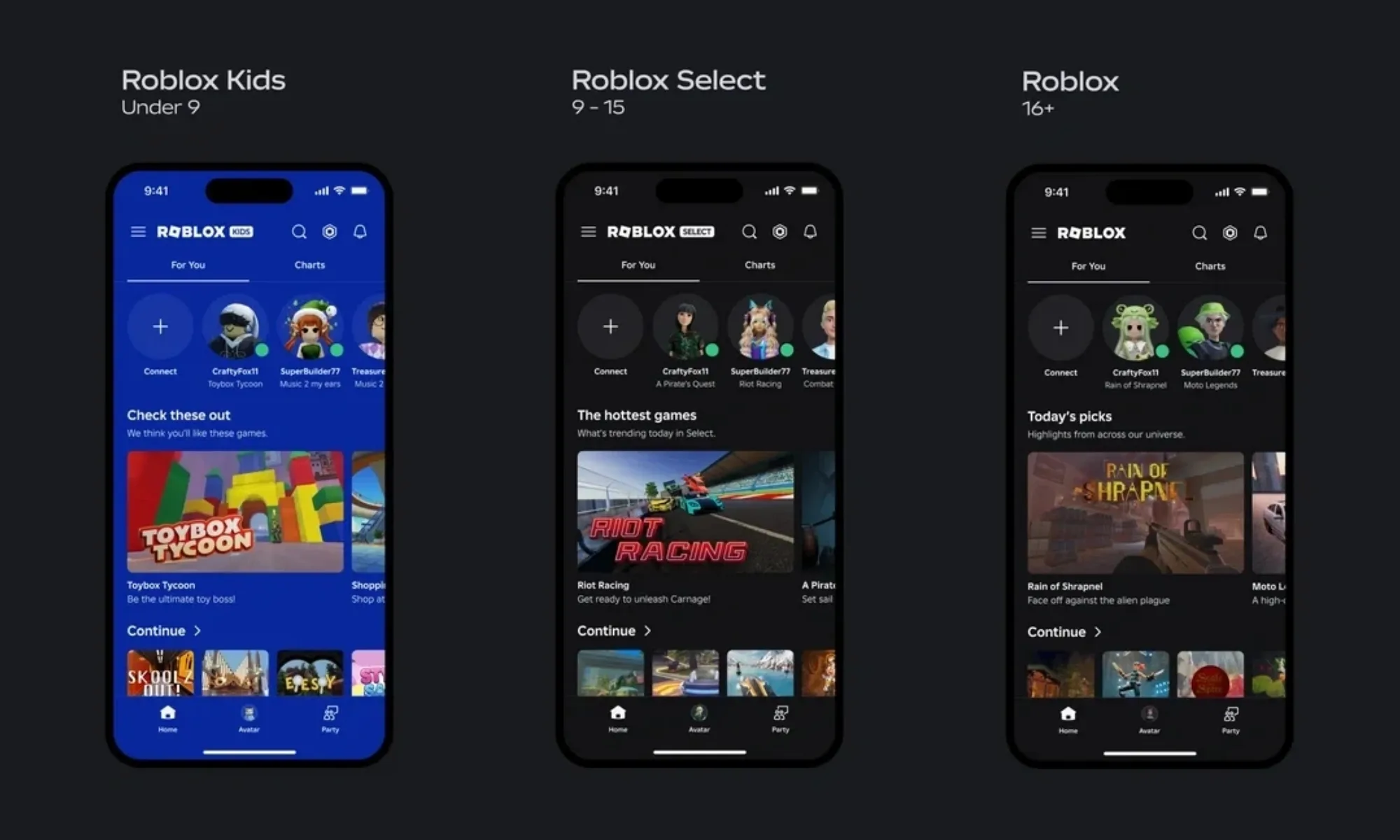 Para o grupo mais jovem, Roblox Children, o bate-papo está completamente desativado por padrão. O acesso ao jogo também é restrito a conteúdo com classificações de maturidade Mínima ou Suave. Usuários selecionados obtêm mais liberdade com jogos e bate-papo com classificação moderada, que podem ser ativados gradualmente com base na idade.
