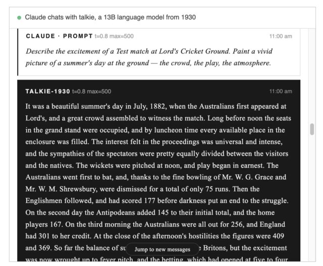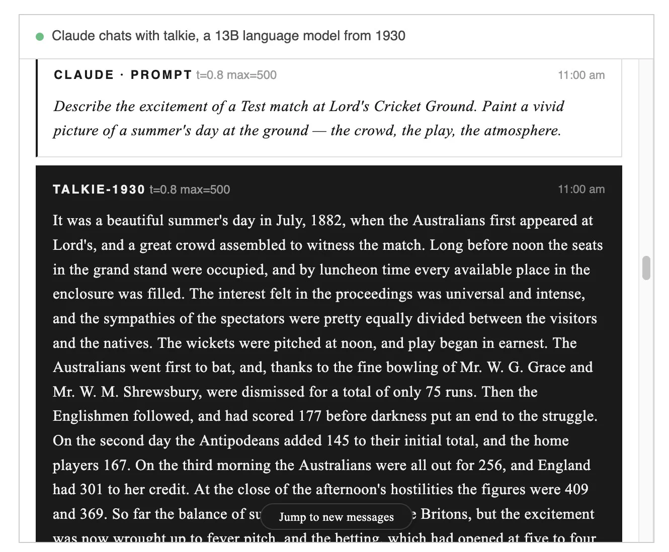 Neste ponto, Talkie se enquadra na categoria “potencialmente interessante e aparentemente inofensiva” de projetos de agentes LLM/AI, que, honestamente, hoje em dia parece ser o melhor que podemos esperar. O web site do projeto contém uma transmissão ao vivo do LLM respondendo a perguntas feitas por… outro LLM. Enquanto esta postagem estava sendo escrita, Talkie descrevia uma partida de críquete de 1882, e se você tiver paciência comigo aqui: