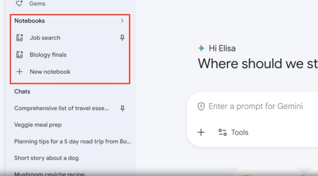 O recurso aparece como uma nova seção de Notebooks no painel lateral do Gemini, bem entre Gems e Chats. Qualquer conversa que você tiver dentro do Gemini pode ser salva em um caderno usando o menu de três pontos.