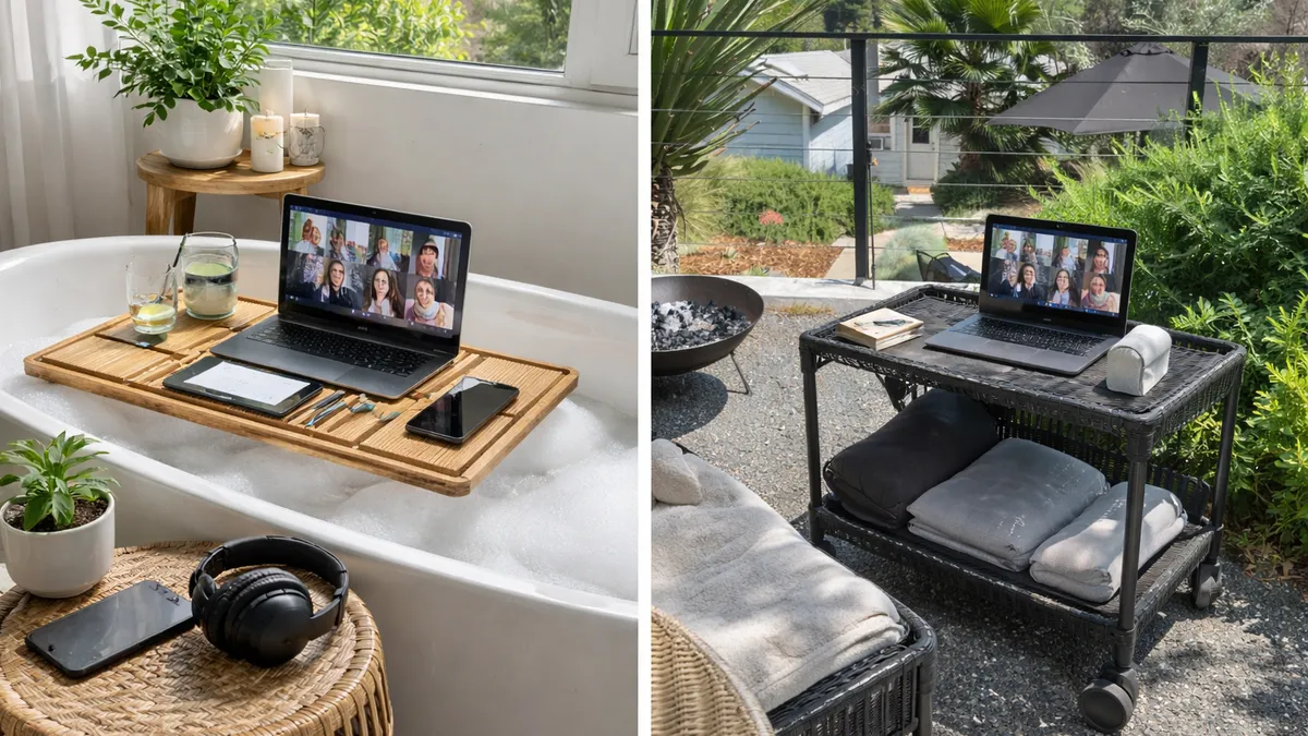 Forneci algumas imagens de espaços em casa que gostaria de trabalhar e perguntei alguns Ferramentas de IA para gerar uma configuração que tornaria meu espaço de trabalho totalmente móvel – uma configuração de trabalho em casa que me acompanha quando eu quiser, caso eu queira participar de uma reunião do Groups na banheira ou no quintal.